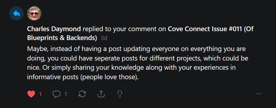 There it was! The connector! I could build a website specifically designed to “teach” (for lack of a better term) aspiring vibecoders and AI builders to build without fear or intimidation by guiding them through a series of prompts and step-by-step checklists that they would be able to adapt to their own projects (I am thinking about building a project idea generator for practice, but let’s focus on the subject at hand), build them, automate them, and deliver them (I read that somewhere). And share snippets of those here on Substack! Maybe even create a new publication as part of Cove Connect.