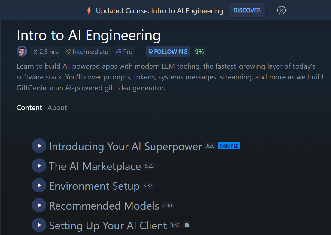 By the end of this course, I’ll be able to explain what AI engineering is (I already can, just in the context of the course; keep up), use system prompts to control model behavior, design predictable UI-friendly output, handle failures, edge cases, and unsafe inputs, move AI interactions to a secure backend, and make informed trade-offs between quality, latency, and cost, among other things. I am quite excited to dive into this updated version of the course and continue with my coding journey.