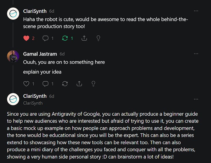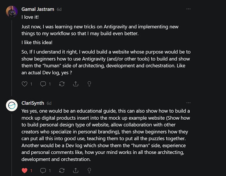 My friend ClariSynth was kind enough during the week to make a suggestion on how I could expand my platform further by using my knowledge to introduce aspiring builders to Antigravity and show them how to do it without being intimidated. Somewhere they could see a more human side of me as I guide them through step-by-step roadmaps to building simple websites and/or apps to get them started and break the ice.
